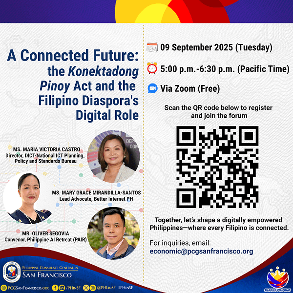🌐 “A Connected Future: The Konektadong Pinoy Act and the Filipino Diaspora’s Digital Role”                                                                       🗓️ 09 September 2025 (Tuesday), 5:00 p.m. Pacific Time                                                                                                                                    📍 via Zoom