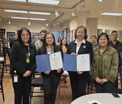 L-R: Deputy Consul General Maria Paz Cortes, Ms. Alicia Cruz, Ms. Nina San Luis, and Consul Rowena Pangilinan-Daquipil pose with personnel of San Francisco PCG after the presentation Certificates of Appreciation. (San Francisco PCG photo)