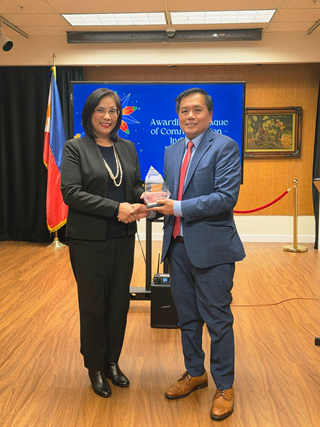 Deputy Consul General Maria Paz G. Cortes presents a Plaque of Commendation to Atty. Flomy Diza for his dedicated service and partnership in advancing the Consulate’s Assistance-to-Nationals programs. Atty. Diza is also a key partner of Post on immigration-related matters, particularly in extending effective legal assistance to individuals detained by U.S. immigration authorities within the Consulate’s jurisdiction. (San Francisco PCG photo)
