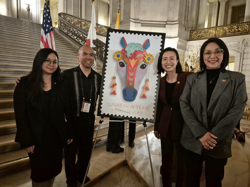 L-R: Vice Consul Glaiza Quarteros, APA Heritage Celebration Co-Chair FilAm Al Perez, Supervisor Connie Chan, and Deputy Consul General Maria Paz Cortes pose with the 2026 Year of the Horse Commemorative stamp (San Francisco PCG photo)