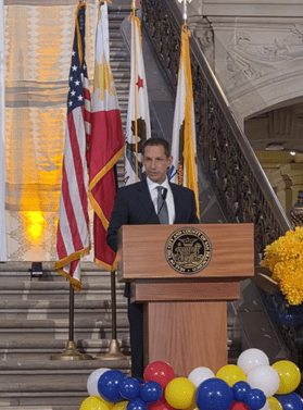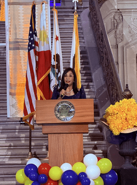 San Francisco City and County Mayor Daniel Lurie (left) and Deputy Consul General Maria Paz Cortes (right) delivering their remarks for the Filipino American History Month celebration at the San Francisco City Hall (San Francisco PCG photo)