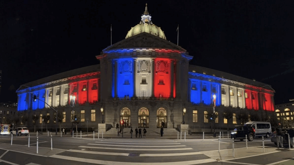 San Francisco City Hall illuminated with Philippine Flag colors on 23 October 2025 as part of the celebration of the Filipino American History Month (San Francisco PCG photo)
