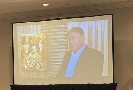A 2019 recorded video of the late Mr. German Palabyab describing his book The Saga of Leyte Gulf was played during the event. (San Francisco PCG photo)