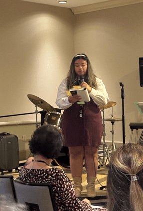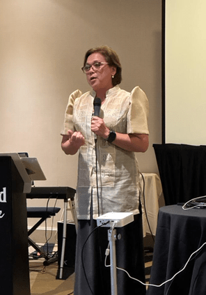 Left: Mrs. Mrs. Lina Palabyab, wife of the late Mr. German Palabyab, shared insights into the inspiration and process behind the creation of the book The Saga of Leyte Gulf. Right: Ms. Mutya Palabyab daughter of the late author, read excerpts from the book. (San Francisco PCG photo)