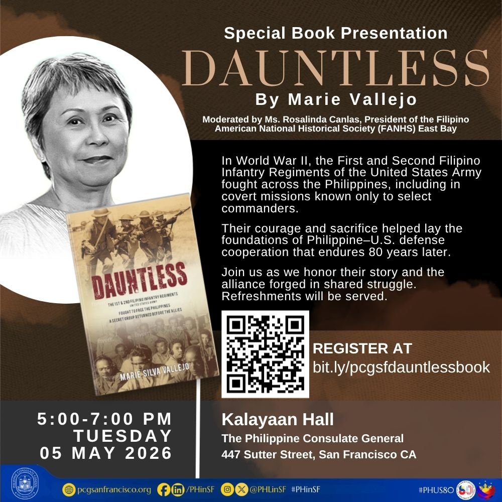 The Philippine Consulate General in San Francisco invites the public to a special book presentation of DAUNTLESS: The 1st & 2nd Filipino Infantry Regiments; United States Army; Fought to Free the Philippines; a Secret Group Returned Before the Allies by Ms. Marie Silva Vallejo.